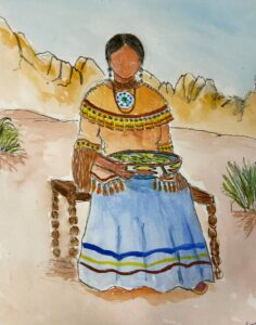an Apache woman prepares to hush and cook corn. Her regalia is a combination of leather blouse with cotton skirt